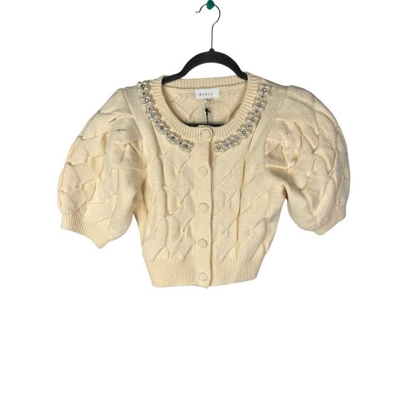 MABLE Women's Cream Pearl Cable Front Button Short Sleeve Sweater Cardigan NWT Small