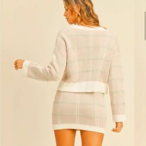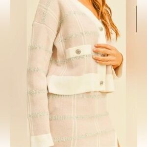 Stylish light pink cream plaid cardigan and skirt set. Features button details and a modern slit.
