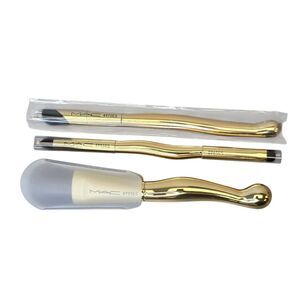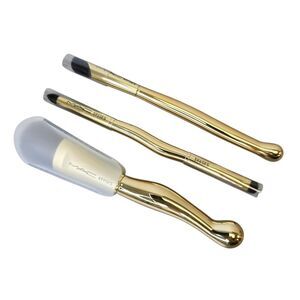 MAC Cosmetics Golden Touch Mini Makeup Brush Kit Set (3 Brushes + 1 Bag)Elegant gold makeup brush set by MAC Cosmetics. Includes three brushes with a stylish gold sequin pouch. Perfect for a flawless application. MAC holiday-exclusive gift set featuring fundamental makeup brushes for face and eyes in travel-friendly sizes at a gold star value.