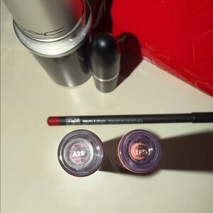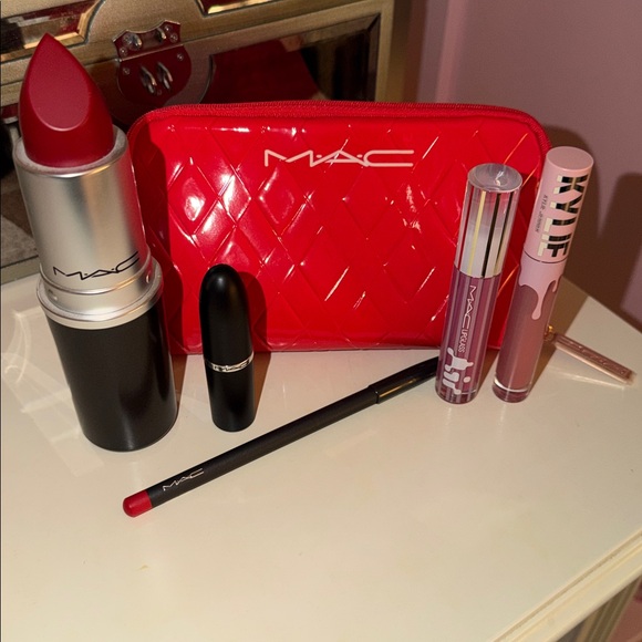 Elevate your style with MAC Cosmetics limited edition set, includes zippered case, Ruby Woo lipstick, Rosy Thoughts LipGlass, Kylie Lip Liquid Lipstick “a moment” #346, and lip liner pencil with a striking lipstick storage container.💄 all brand new never used, no flaws, brand new 🆕