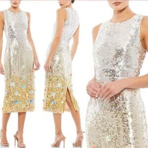 This chic, fully sequined midi dress has a metallic silver bodice that gradually transitions to a metallic gold mid-thigh. The straight, midi-length skirt is embellished with stunning hand-beading and 3D floral accents.