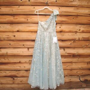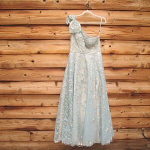Serve up head-to-toe beauty in this incredible gown. Made from shimmery, botanical-embroidered tulle, the feminine gown is detailed with rhinestone trim at the waist and topped with a feminine full bow at the single shoulder. It’s glamorous, romantic—and with a high leg slit—flirty, too.