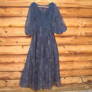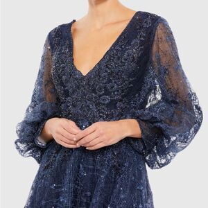MAC DUGGAL 20283 Womens Blue Embellished Plunge Neck Puff Sleeve A Line Gown