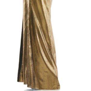 Metallic gown with asymmetrical one shoulder neckline and thigh high slit.