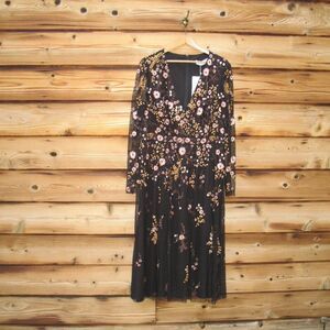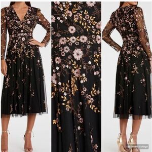 This ethereal cocktail dress is made from soft netting embroidered with pastel botanicals. The dress is styled with a surplice v-neckline, sheer long sleeves, and a subtle a-line skirt. Lightweight and fully lined through the body, this dreamy dress will be your go-to for any féte.