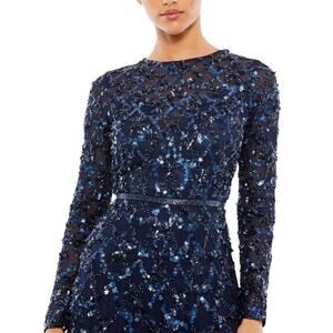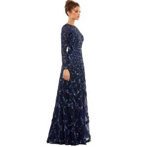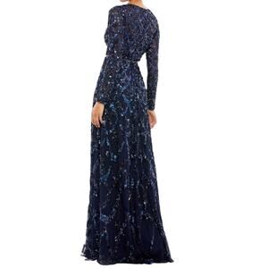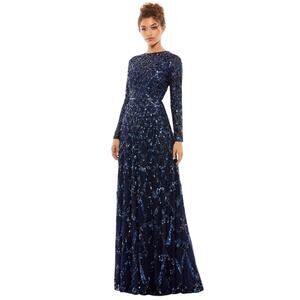 Make a statement in this stunning embellished long sleeve gown. Its flattering a-line silhouette, high neckline, and allover sequins and beading detail make it the perfect gown for evening events and black-tie affairs.