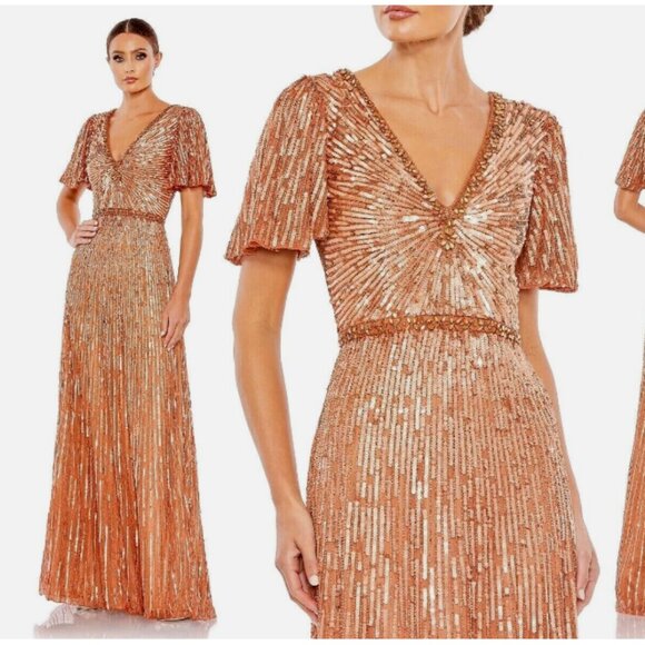 MAC DUGGAL 5538 EMBELLISHED V-NECK BUTTERFLY SLEEVE COLUMN COPPER GOWN sz 2