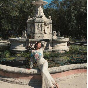Adorned with intricate embellishments and a vibrant floral pattern, this gown exudes elegance and charm. The high neckline adds sophistication, while the multi-color design brings vibrancy and life to the ensemble.