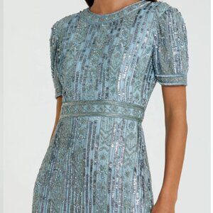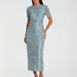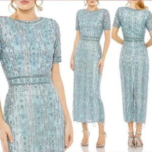 MAC DUGGAL 5980 HIGH NECK SHORT SLEEVE CRYSTAL FRINGE FRENCH BLUE MIDI DRESS 12