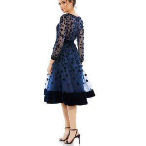 Elegant tea-length cocktail dress with a semi-sheer illusion yoke and sleeves, tulle overlay skirt, and intricate velvet floral accents and beading throughout. A tonal velvet band accents the natural waist, and the skirt is finished with a velvet-trimmed bottom hem.