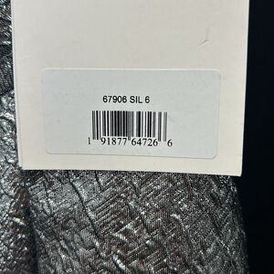 Stunning metallic tea-length dress with dramatic bow one-shoulder detail and functional pockets.
