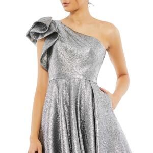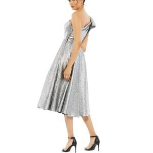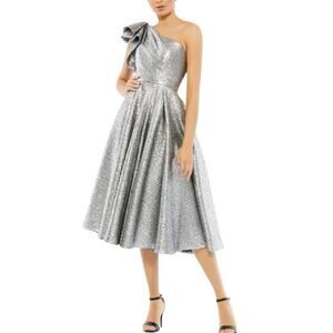 MAC DUGGAL Silver One Shoulder Bow Midi Dress