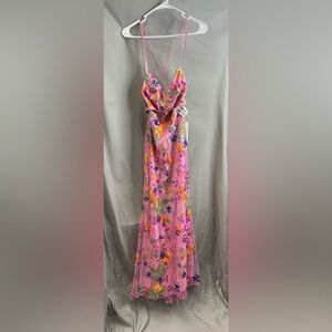 Who knew romantic lace and bright sequins would make the chicest duo ever? Color us obsessed with this slim-fitting gown styled with spaghetti straps, a sweetheart neckline, and side cutouts. The crisscross and lace-up back detail adds a fresh finish.