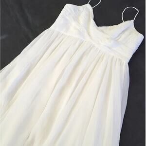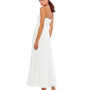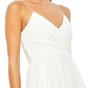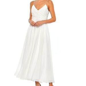 Mac Duggal 70099 Faux Wrap Flowy Midi Dress Size Medium New without Tag This spaghetti strap chiffon dress features a crossover v-neckline, ruched bodice, and a midi-length A-line skirt. Chiffon Fabric (100% polyester) Fully lined V-neck Sleeveless Ruched bodice Concealed back zipper Approx. length from shoulder to hem: 50" Color: White