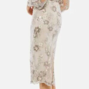 MAC DUGGAL 70237 EMBELLISHED HIGH NECK ILLUSIONS LONG SLEEVE MOCHA MIDI DRESS 14