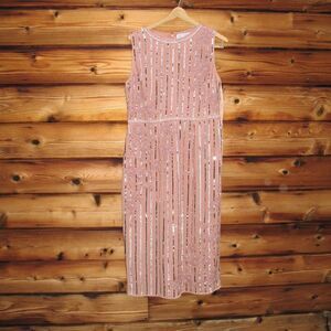 Chic sleeveless midi dress with rows of vertically-striped sequins throughout. Intricate, hand-beaded flowers adorn the bodice and skirt, and crystals accent the neckline and waist.