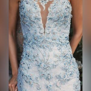 MAC DUGGAL 79264 Blue Embroidered Applique Feathered One Shoulder Trumpet Gown