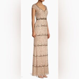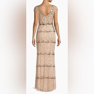 Mac DuggalHand-beaded embellished fabric (100% polyester)Fully linedSweetheart necklineCap sleevesScalloping detailBeaded detailingBack zipperColor: Nude/GoldPlease note due to the intricate nature of the gown, it's possible there could be a slight flaw (loose string, missing bead, etc.) After close review, l'm not finding anything major.