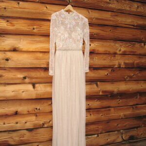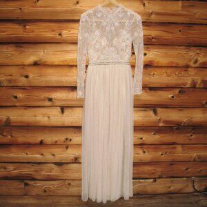 Exude elegance in this stunning hand-embellished gown. The long sleeves and micro-ruffle collar add sophistication, while the beaded waist detail accentuates your figure. Perfect for formal events, this gown is sure to make you stand out with its delicate and luxurious design.