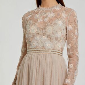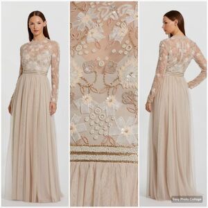 Exude elegance in this stunning hand-embellished gown. The long sleeves and micro-ruffle collar add sophistication, while the beaded waist detail accentuates your figure. Perfect for formal events, this gown is sure to make you stand out with its delicate and luxurious design.