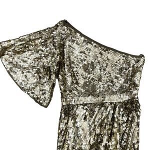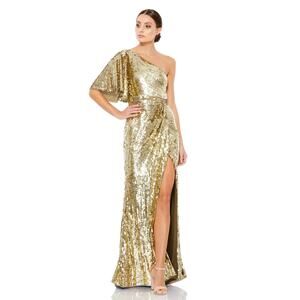 Gorgeous one-shoulder bell sleeve gown is fully embellished with metallic gold sequins and features a sexy thigh-high slit.