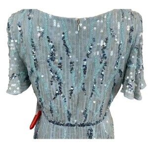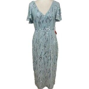 MAC DUGGAL 93591 SEQUINED V-NECK FLUTTER SLEEVE TEA LENGTH POWDER BULE GOWN 18