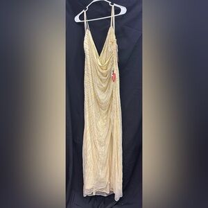 Set off fireworks in this wow-worthy gown. Made from mesh streaked with sequins and beads, this sparkling dress is designed in an ultra-flattering silhouette with a V-neckline, ruched, wrap-look bodice, peek-a-boo front slit, and beautiful open back. Add leg-lengthening platforms for an extra height boost.