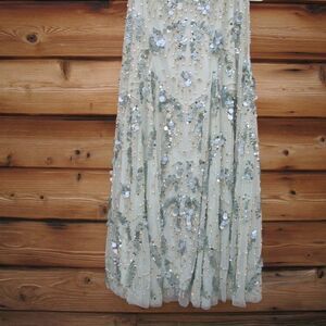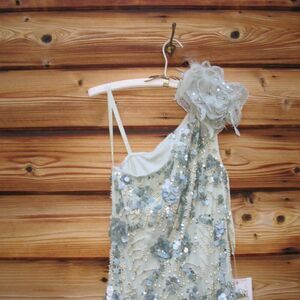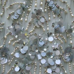 This ethereal trumpet gown, embellished with delicate sequin, pearl, and beaded details, features a graceful silhouette and a feathered flower accent, radiating timeless glamour—perfect for weddings, galas, and unforgettable occasions.