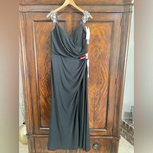 MAC DUGGAL Black Floral Embellished Strap High Slit Evening Gown