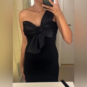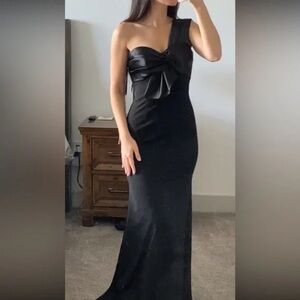 Looking to achieve siren status? Enjoy your starring role as best-dressed in this divine mixed-media gown. Cut from smooth fabric in a sleek, body-skimming silhouette, the dress is accented with a single satin shoulder and pleated bow bodice. It’s punctuated by a sweep train.