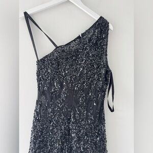 MAC DUGGAL Black One Shoulder Sheer Hand Sequined Mini Dress 4