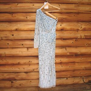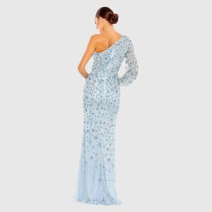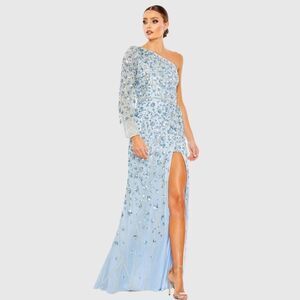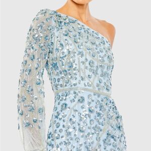 MAC DUGGAL Blue Embellished One Sleeve Faux Wrap Gown 8