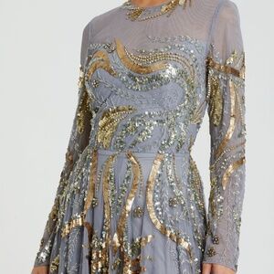 MAC DUGGAL Blue and Gold Long Sleeve Embellished Illusion Evening Gown
