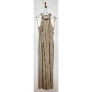 MAC DUGGAL Bugle Bead Halter Sheath Gown in Nude Silver Size US 8