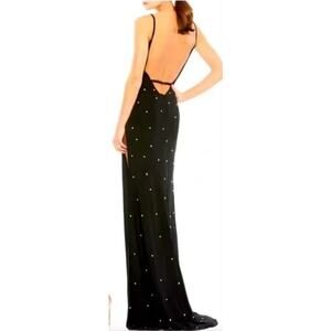 Spaghetti-strap stretch jersey gown featuring all-over rhinestone accents, a thigh-high slit, and a daring open back for a glamorous, sultry look.