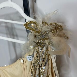 Floral detail atop left shoulder accented by dainty feathers, beads, and sequins