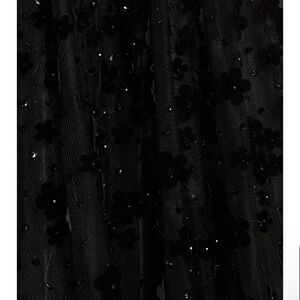 Elegant tea-length cocktail dress with a semi-sheer illusion yoke and sleeves, tulle overlay skirt, and intricate velvet floral accents and beading throughout. A tonal velvet band accents the natural waist, and the skirt is finished with a velvet-trimmed bottom hem.