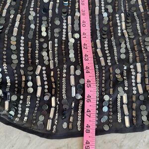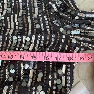 Elevate your evening ensemble with our opulent georgette cocktail dress, meticulously hand-embellished with alternating rows of paillettes, sequins, and rhinestones. Fully lined through the bodice and skirt, its semi-sheer unlined sleeves add a touch of allure, making it the quintessential choice for fall and holiday soirées.