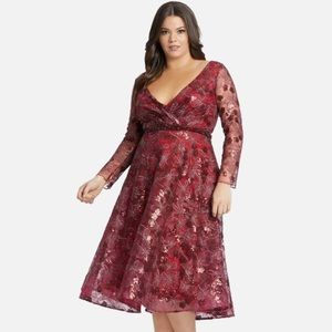 Glamorous and Flattering: Plus-size fit and flare dress with illusion long sleeves, adorned with exquisite embellishments.