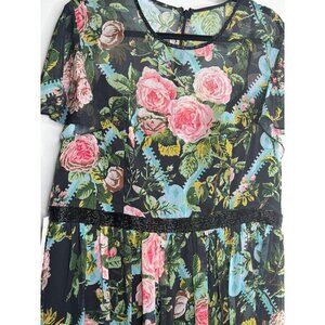 This floral print chiffon midi dress has a high round neckline, semi-sheer flutter sleeves, and a pleated midi-length skirt. A black hand-beaded belt accents the natural waist.