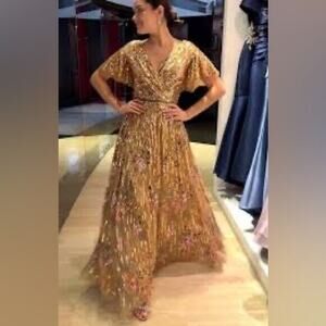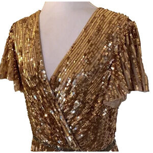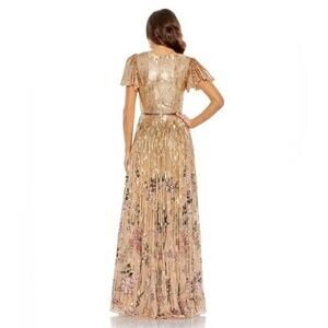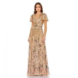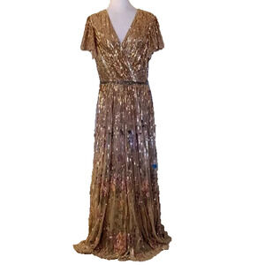 MAC DUGGAL FLORAL SEQUINS FLOUNCE SLEEVE V NECK GOWN 5637 COPPER Sz 18 $798.