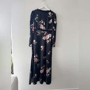 Black floral crepe (100% Polyester). A-line. Long sleeves. Crewneck. Back zipper closure. 61" from shoulder to hemline. Imported.