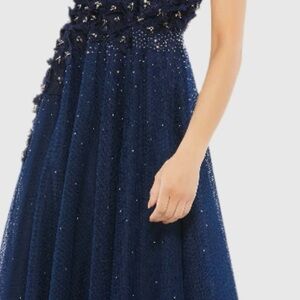 Sleeveless a-line midnight blue formal dress with 3-D embroidered floral appliques, heat-set crystals, and v-back.