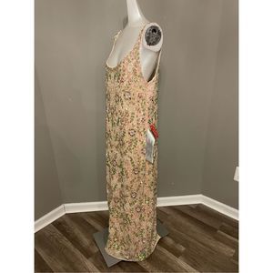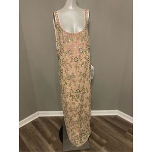 Elegant fully beaded floral midi cocktail dress with a scoop back and back slit.