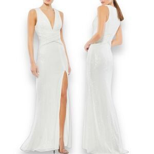 Make a statement at your next formal event in this stunning sequined V-neck wrap waist gown by MAC DUGGAL Ieena. The elegant white color is perfect for weddings and formal occasions. The designer, Mac Duggal, is known for creating high-quality, glamorous dresses that are sure to turn heads.