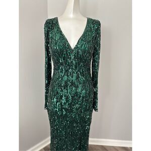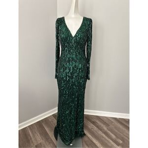 Long sleeve, fully embellished gown with a fitted bodice, plunging v-neckline, full-length skirt with a sweeping train, and gorgeous sequin and bead detailing throughout.