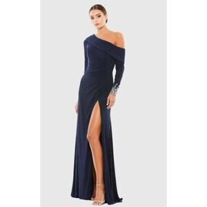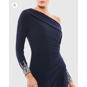 MAC DUGGAL Midnight Navy Beaded Cuff Drop Shoulder Faux Wrap Gown. NWOT
