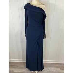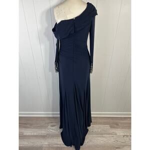 MAC DUGGAL Midnight Navy Beaded Cuff Drop Shoulder Faux Wrap Gown Size 6. NWOT