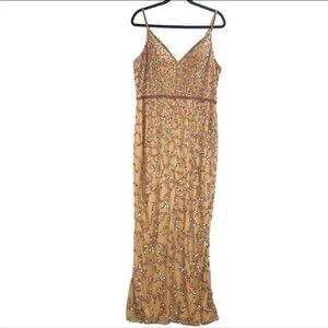 * Nude with rose gold sequins and beaded waist and straps, v-neck column floor length gown