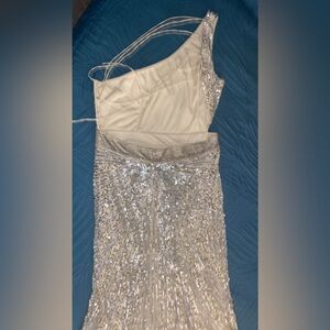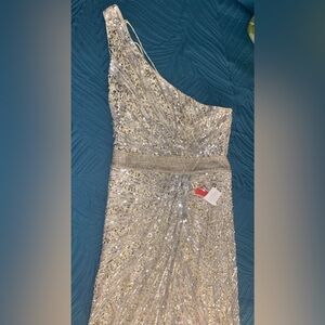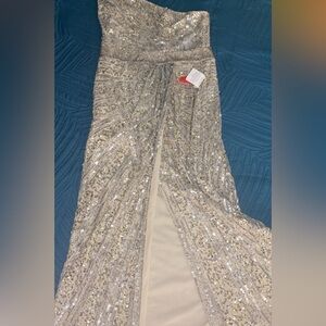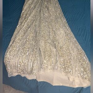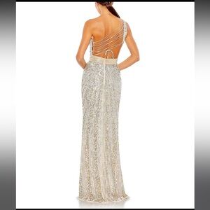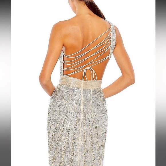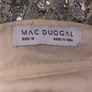 Size 16!! ONLINE EXCLUSIVE Mac Duggal Gown. Made in India. This gown is so unique and stunning. The reflective sequins shift from copper to a beautiful baby blue and back to silver. The Beaded belt is tight and will snatch you in without hurting you. The back is Corseted with very soft silky string and it leaves ample room for my large busted ladies. This NWT, NEVER BEEN WORN. Has no stretch and fits closer to a true size 14 than a 16. Sequin gowns have thousands of sequins and beads, sometimes they shed. This is normal, please be aware that this will happen. There is no way of avoiding it. In the last picture there are a few tiny flaws that I recently noticed. They are barely detectable, and under the arm area, but I wanted to be sure to note them. Discounted price for the few blemishes.This gown is flashy and fun, comes from a pet and smoke free home. Thank you for looking and God bless
